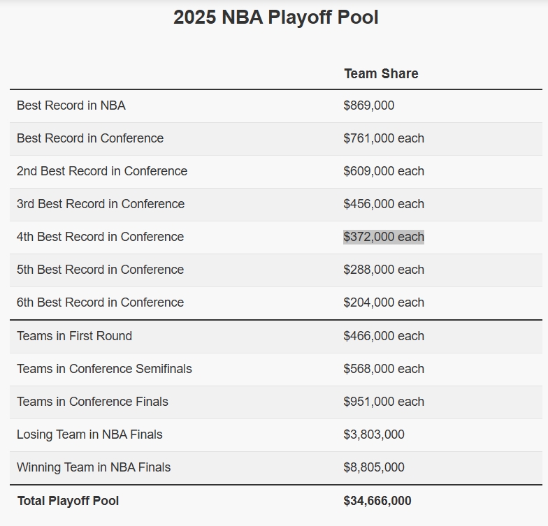 06月21日讯 雅虎体育消息,NBA联盟根据各队的常规赛战绩和季后赛战绩分发相对应的奖金,如下图所示——