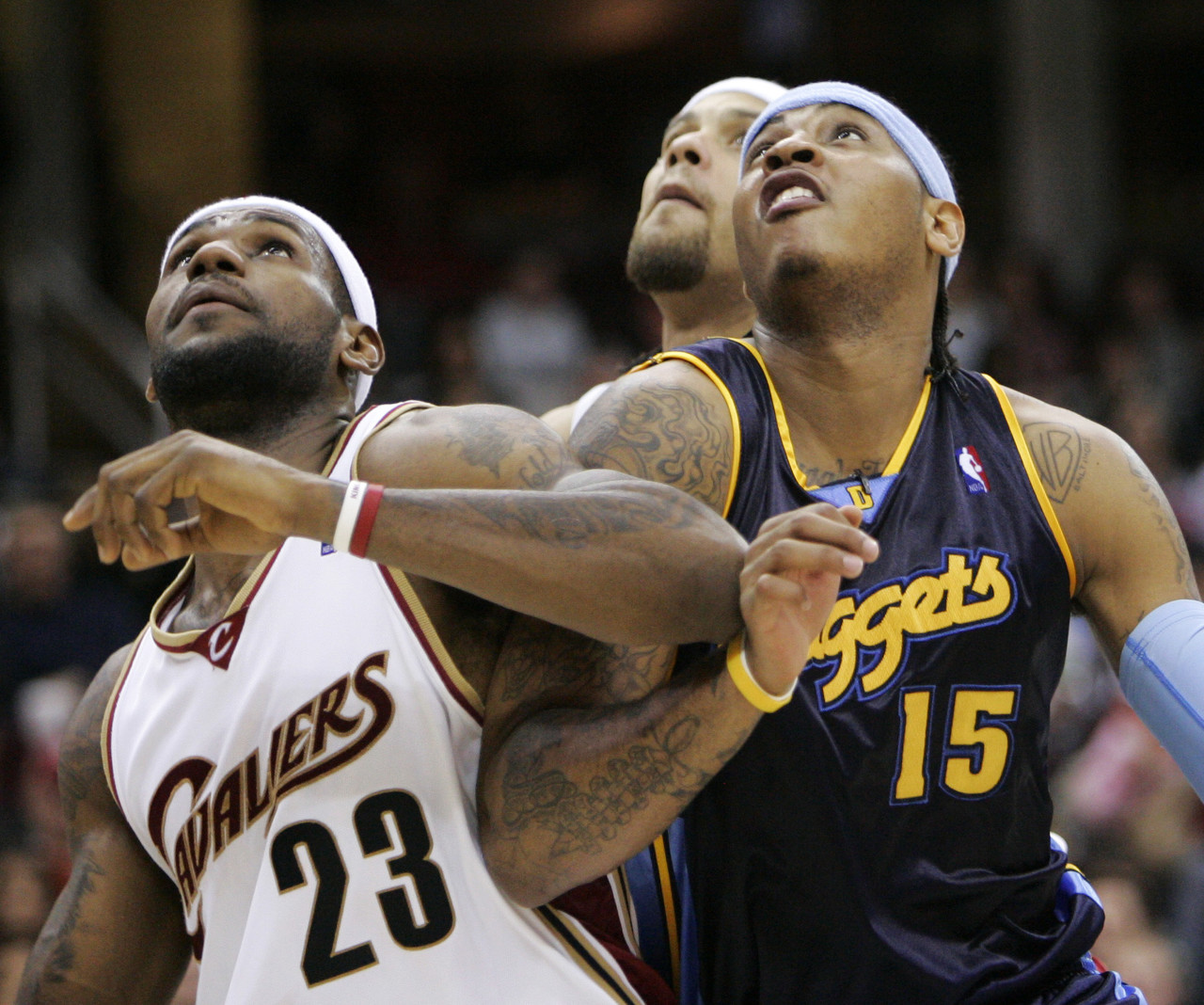 2003-04赛季,安东尼场均21分6.1篮板2.8助攻,掘金队最终43胜39负排名西部第8进入季后赛,詹姆斯场均20.9分5.5篮板5.9助攻,骑士队最终35胜47负未能进入季后赛。2003年最佳新秀评选,詹姆斯得分508分排名第一,安东尼得分403分排名第二。