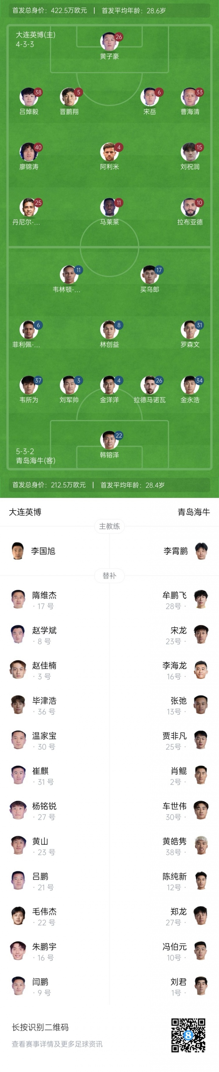 大连英博vs青岛海牛首发:4外援PK3外援 廖锦涛、罗森文出战!